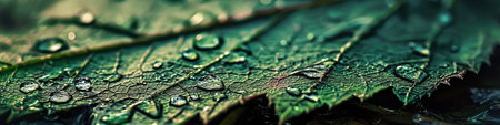Close-up view of a leaf, with water droplets on its surface and visible veins. Generative AI