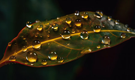Vibrant leaf vein reflects wet dew drop in fresh nature generated by artificial intelligence