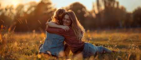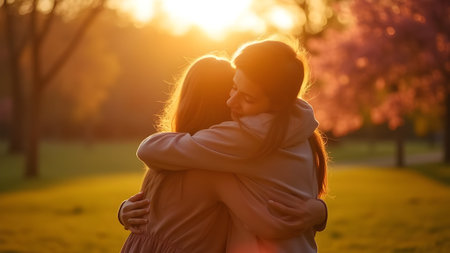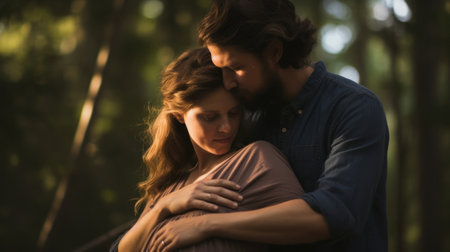 A man gently hugs and comforts a woman who rests her head on his chest with a sad expression in a park at sunset. The warm backlight emphasizes the emotional connection, empathy, and support within the relationship.