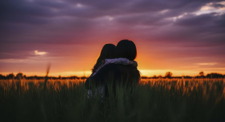 Mother hugging her young daughter in a vast golden field, silhouetted against a vibrant, dramatic sunset sky with warm orange and purple hues.