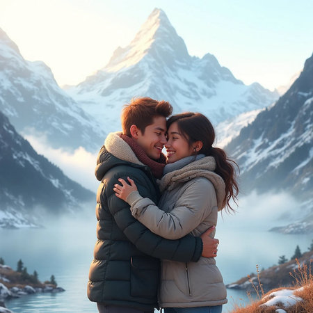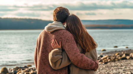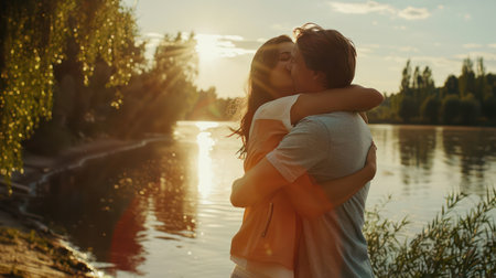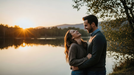 A couple embraces each other in front of a serene lake and mountain landscape. The warm light of the setting sun bathes the scene in golden hues. The composition suggests a moment of intimacy and affection, suitable for various editorial and commercial applications. The environment is outdoors, during the day.