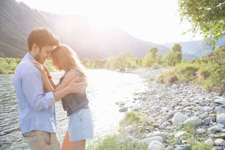 Young couple hugging on Toce riverbank, Piemonte, Italy