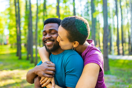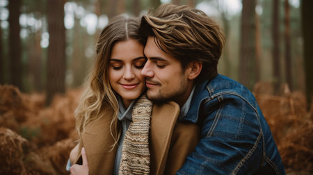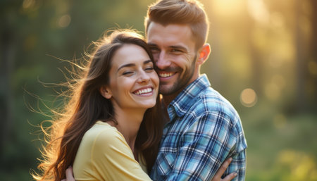 A happy couple stands closely together, radiating joy and warmth in a sun-drenched forest. Their genuine smiles and affectionate embrace capture the essence of love and connection amidst natures beauty.