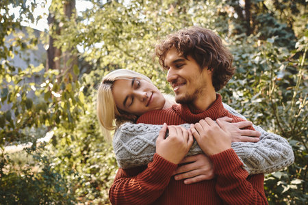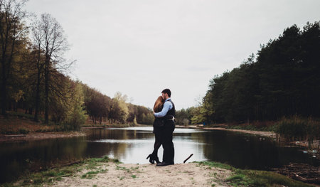 beautiful romance of lovers on valentines day in nature outdoors embracing with affection pragma
