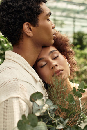 In a vibrant greenhouse, a young couple shares a loving embrace among lush greenery.