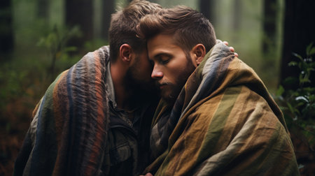 Gay love, non-traditional values and freedom of speech. Two young attractive guys are sitting wrapped in a warm blanket in the forest. Generative AI