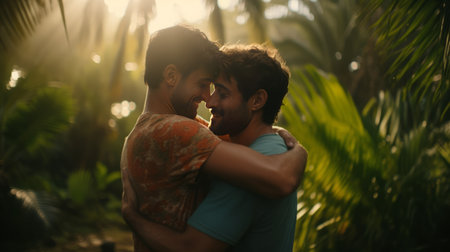 Gay love, non-traditional values and freedom of speech. Two young attractive guys hugging walking through the rainforest among green palm trees on the coast. The honeymoon. Generative AI.