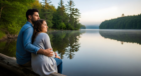 A loving couple sits closely together on a log by a calm lake, gazing at the serene water and forest reflection during a peaceful sunrise. The romantic scene captures a moment of intimacy and connection with nature in a quiet outdoor setting.