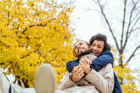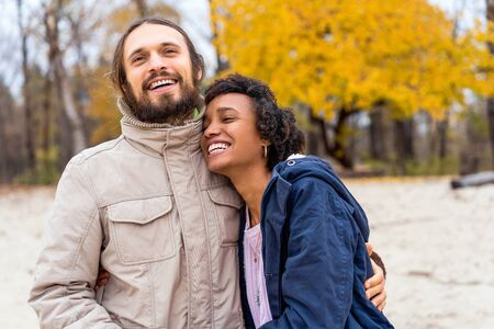Young couple in love embracing in the autumn field. A man and a woman hug each other.