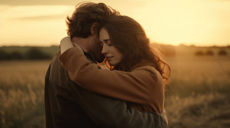 Loving couple embracing outdoors at sunset, conveying warmth and affection.