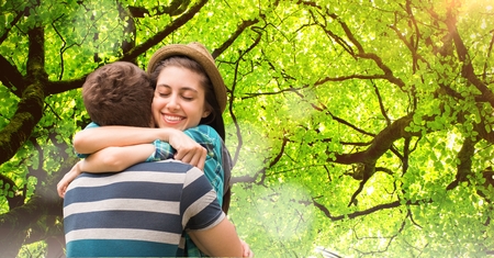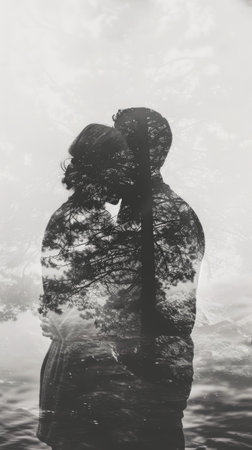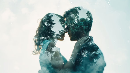 Romantic Double Exposure of Embracing Couple Blended with Lush Forest
