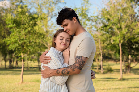 A handsome young couple embraces warmly outdoors, surrounded by lush greenery. The person with light hair rests contentedly against their partners shoulder. Its a bright, joyful moment.