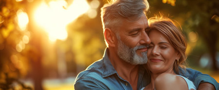 Affectionate mature couple in a loving embrace, basking in the warm sunset light
