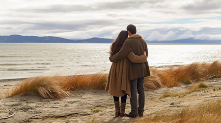 Generative AI : Loving couple hugging at the beach caucasian people people nature and lifestyle concept