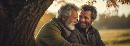 Gay love, non-traditional values and freedom of speech. Two young attractive guys hugging walking in the woods in autumn. Generative AI.