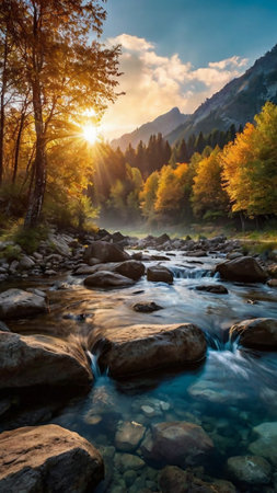 Serene Mountain River at Sunset with Evergreen Forest