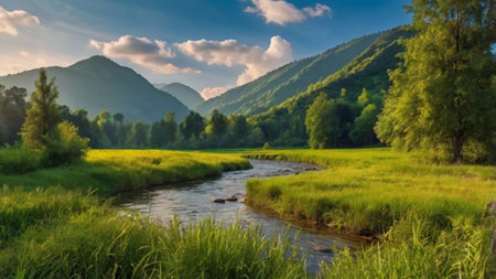 Beautiful summer landscape in the mountains. The river flows through the meadow.