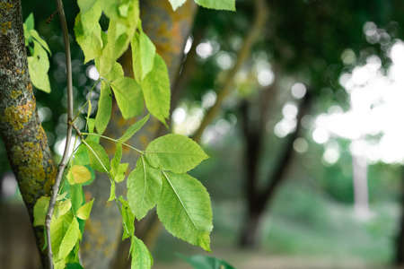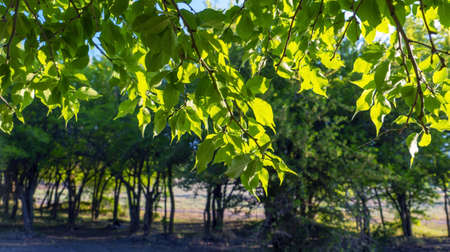 Vivid leaves of trees on bokeh background. Rich greenery in sunlight with copy space. Lush foliage close-up in sunny day. Natural green backdrop of scenic nature in backlight. Abstract texture.