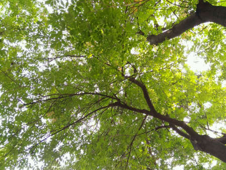 Looking up at big tree, green leaves, blue sky and sunshine on beautiful natural background. Space for text in template. Green background, Tree silhouette on sky. Abstract branch and leaves.