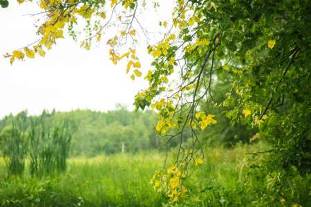 Fresh spring morning colors yellow brown blue needle tree fir branch in a sunny sunset forest park blurry background with free copy space for text. Photo in retro vintage hipster style of processing