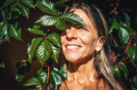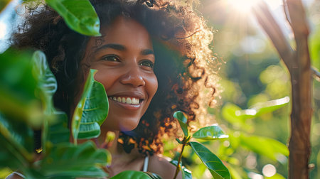A radiant woman smiles brightly among vibrant green leaves, embodying beauty and happiness in a natural setting, inviting warmth and positivity.