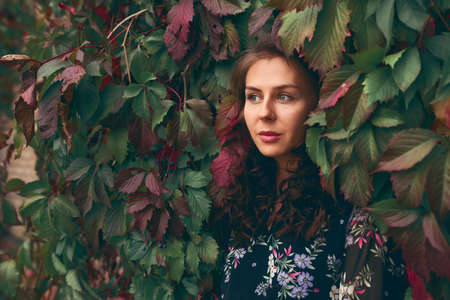 Sensual portrait of young brunette woman among greenery in park or garden. Calm moment. Stylish millennial girl standing in green leaves in city street.