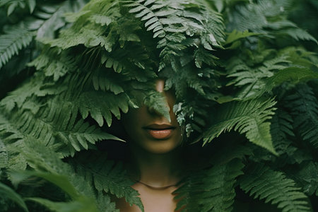 A serene face partially hidden among lush green foliage, symbolizing harmony with nature