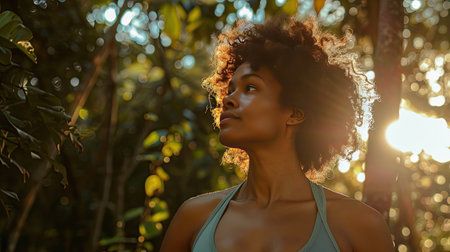 woman's face with gentle sunlight filtering through forest leaves, woodland background generative ai
