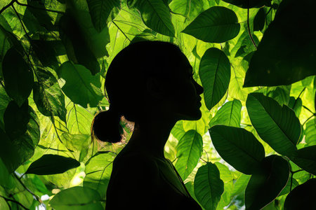 This captivating image showcases a female silhouette infused with vibrant green foliage. The sunlight filters through, creating a glowing effect that enhances the connection between humanity and nature. Emotions of serenity and unity are embodied within the portrait, set against a softly lit, blurred natural background.
