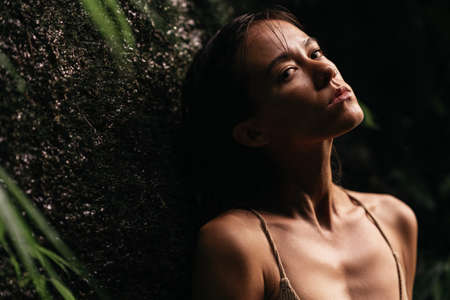 Beautiful young woman with green eyes and sensual lips portrait among huge green banana tree leaves.