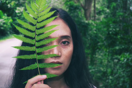 Beautiful young woman closeup face with natural make up and frackles posing front of plant tropical green leaves background with fern