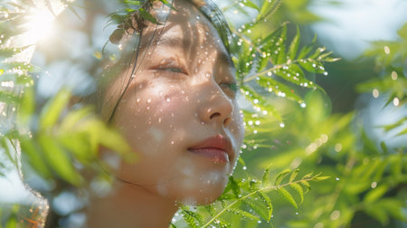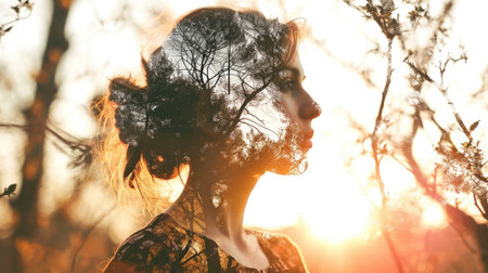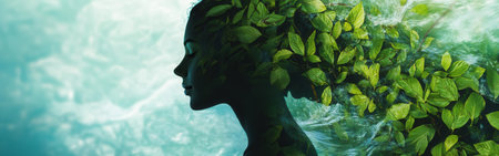 The image features a woman's profile, seamlessly blending with vibrant green foliage. The sunlight casts a warm glow, creating an ethereal quality. The background appears partially transparent, emphasizing the connection between humanity and nature. This poignant representation showcases the beauty of environmental sustainability and harmony.