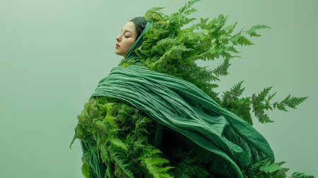 A captivating portrait of a woman draped in lush greenery, embodying the essence of nature with elegance and tranquility against a soft green backdrop.
