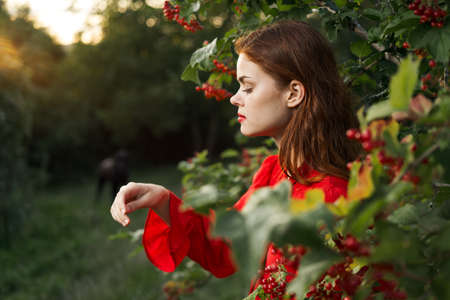 happy red-haired woman on nature in the forest near green trees Summer sun