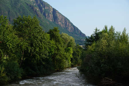 A valley with a creek in the middle of a fir forest in the Italian Alps (Trentino, Italy, Europe)