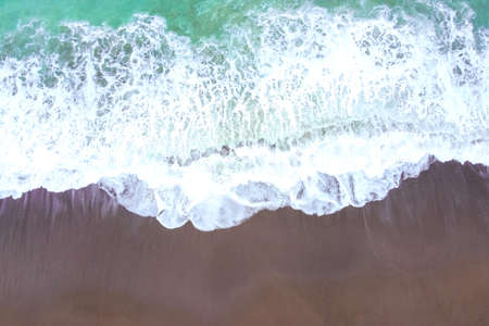 Turquoise foaming sea or ocean wave rolls onto a sandy shore. The top view from a height. Light storm in windy weather. Beautiful and calming seascape for wallpaper. Travel and vacation concept.