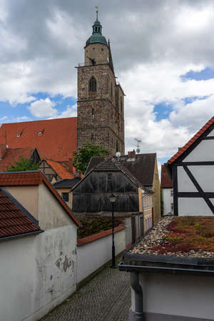 Streets of old town. In the background, the Church of St. Nicholas. Juterbog is a historic town in north-eastern Germany, in the district of Brandenburg.
