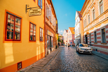 Cheb, Western Bohemia, Czech Republic, 14 August 2021: narrow picturesque street with medieval colorful gothic merchant houses, Eger at sunny summer day, historic renaissance and baroque buildings