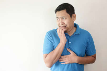 Portrait of young funny Asian man biting his nails as if he is worried afraid of something bad