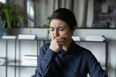 Head shot unhealthy young indian woman feeling unwell at workplace, sneezing in hand. Sick millennial mixed race female worker employee caught cold, suffering from dry cough, corona virus symptoms.