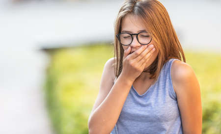 Asian child girl checking breath with her hand,woman have bad breath,bad smell,feel stinks,foul mouth from inside the mouth,tongue and tooth decay,oral health problems,halitosis,health care concept