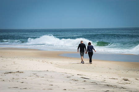 A middle aged couple goes for a walk along the beach on Long Beach Island along the Jersey shore