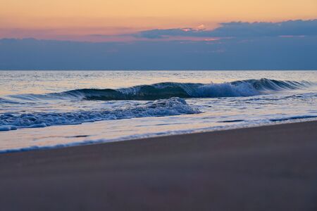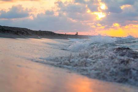 Sandy beach on a sunset with reflection on wet sand and waves with foam. Copy space.