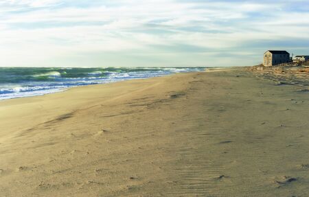 NANTUCKET ISLAND, MASSACHUSETTS, USA - NOVEMBER 14: Beautiful beach with house at the end of summer with sand dunes on Nantucket Island on November 14, 2018.