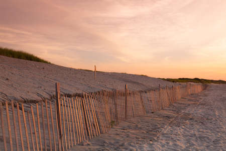 Wooden fence on a dune with the ocean in the background Cape Cod in springtime