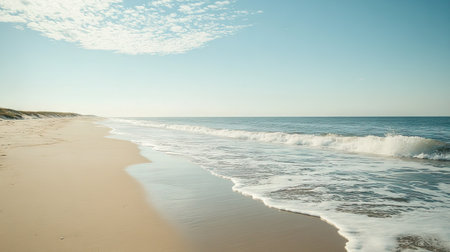 A peaceful stretch of coastline showcases smooth, rolling waves crashing onto a sandy beach. The tranquil blue water reflects the clear, bright sky in the early morning light.