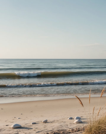 A beautiful, sunlit beach scene featuring rolling ocean waves meeting a golden sandy shore with coastal dunes and a vast, clear sky.