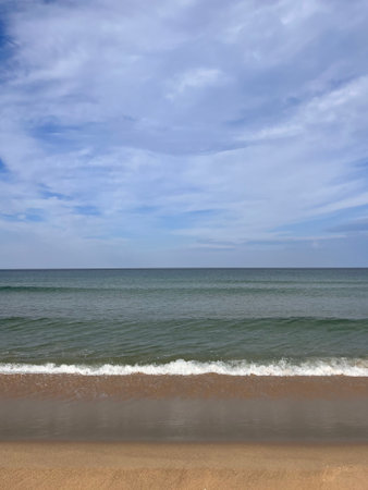 Sea beach view. Clear weather over undulating sea. Cloudy blue sky. Golden sand.