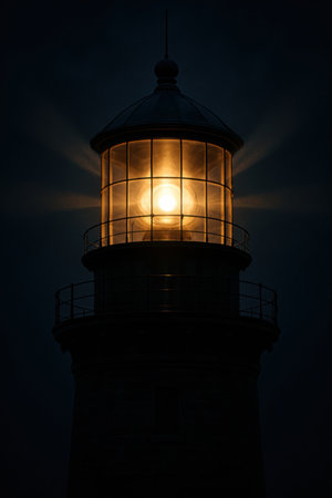 A lighthouse stands tall in the darkness, its powerful beacon glows warmly to guide sailors safely to shore. The contrast between the dark night sky and the bright light creates a dramatic maritime scene, perfect for themes involving safety, navigation, and coastal landmarks.