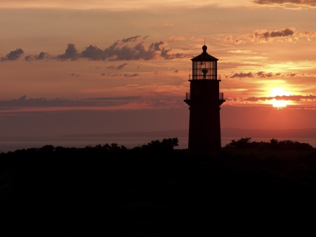Sun sets behind Nobska lighthouse on Cape Cod in summer.